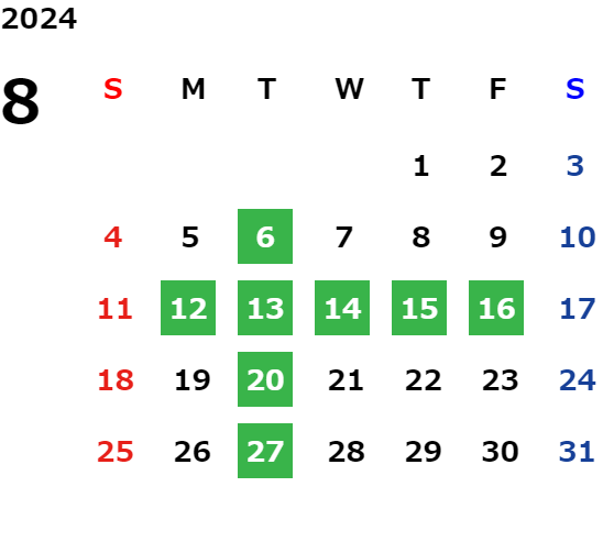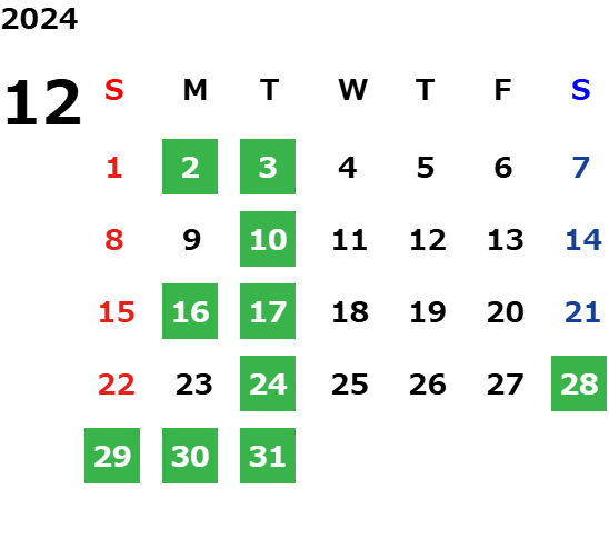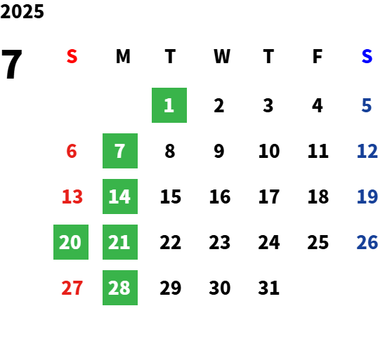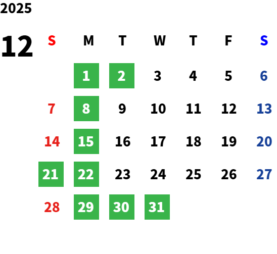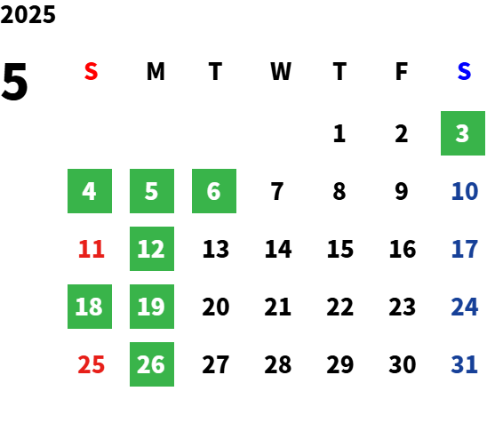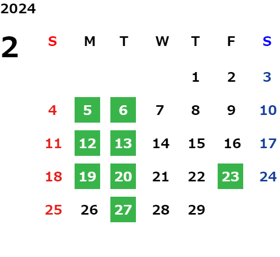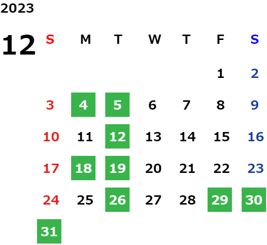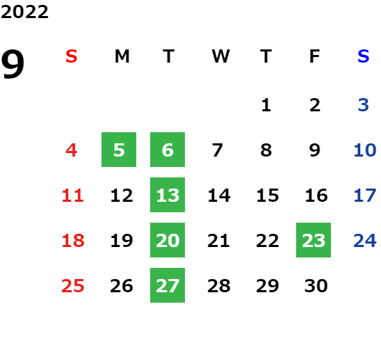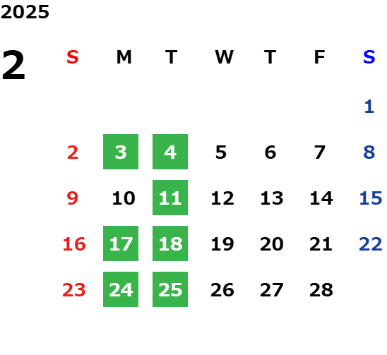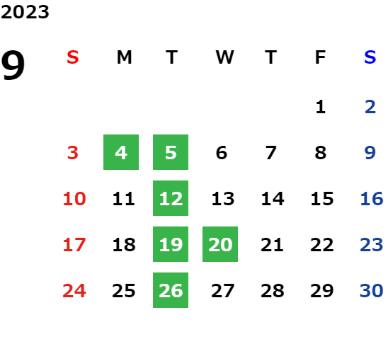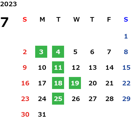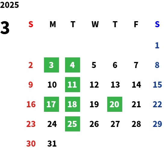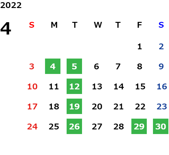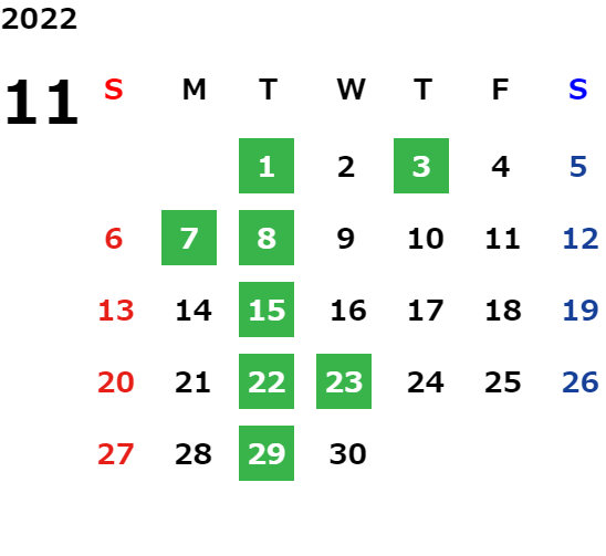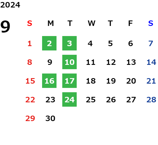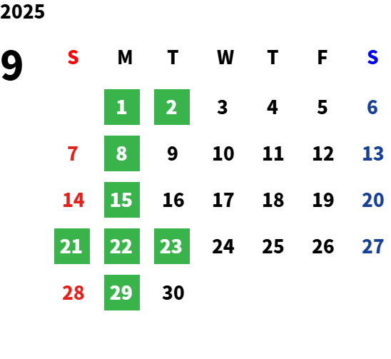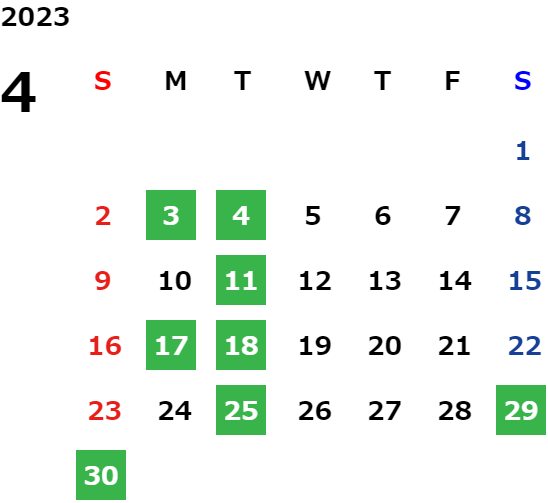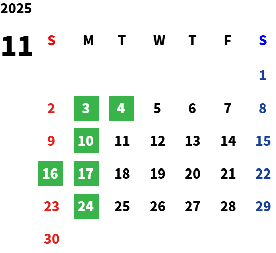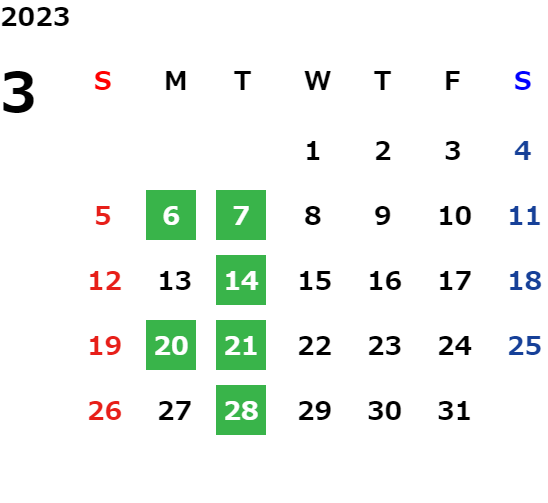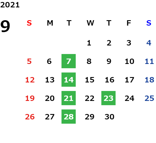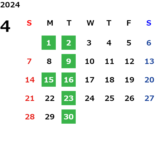 ※毎週月曜日、第一火曜日、第三日曜日が基本的に定休日となります。