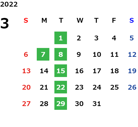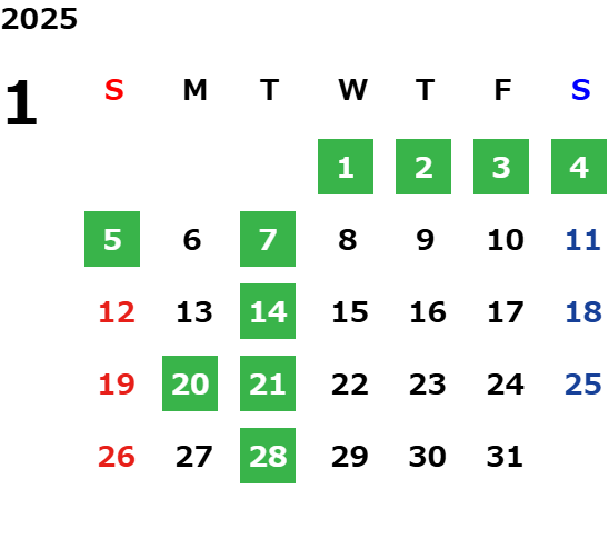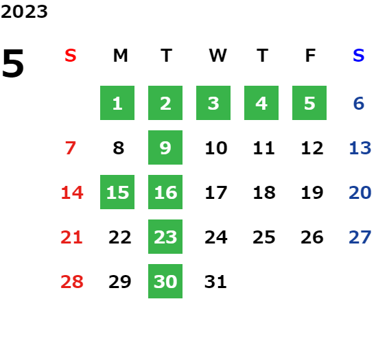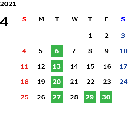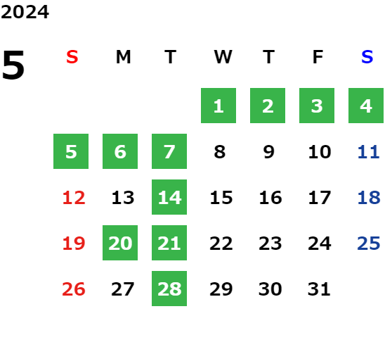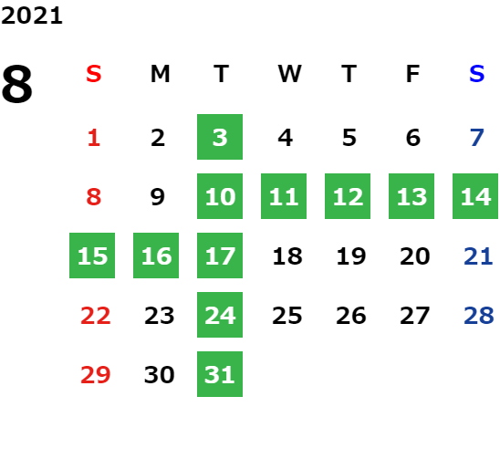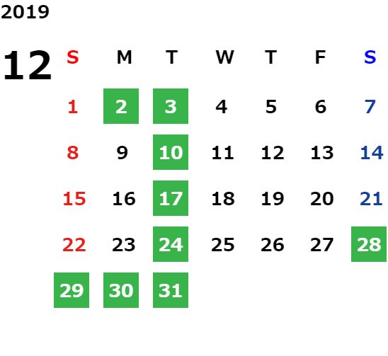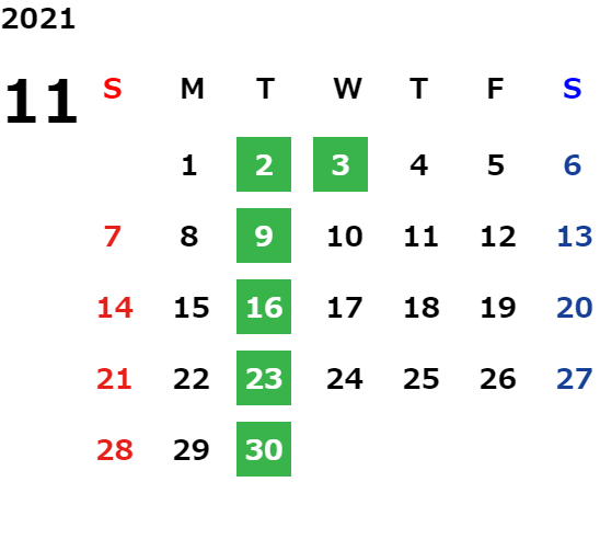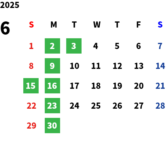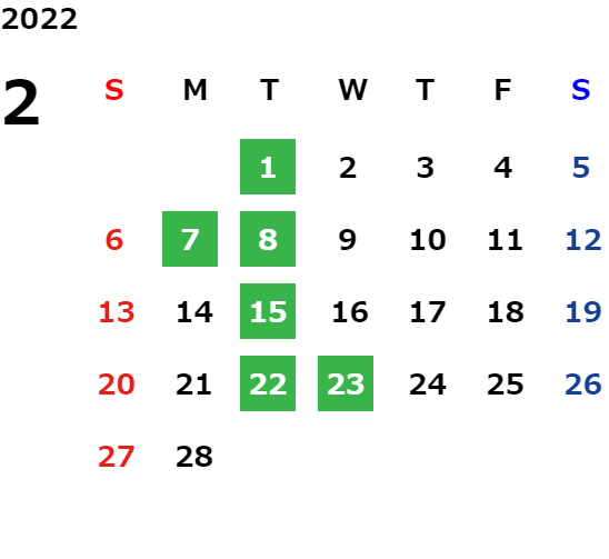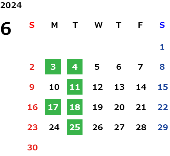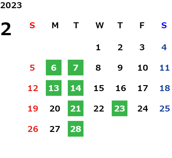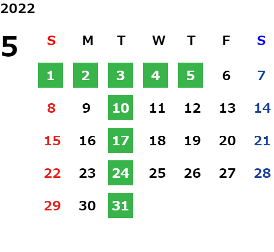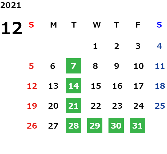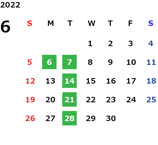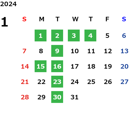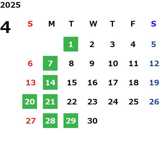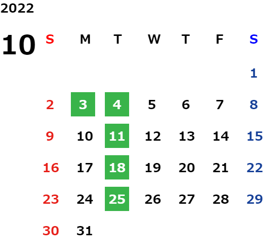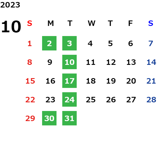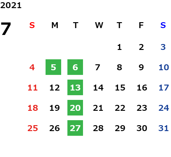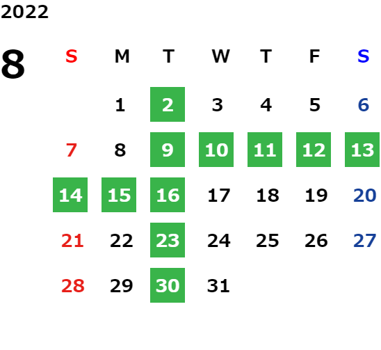 ※毎週月曜日、第一火曜日、第三日曜日が基本的に定休日となります。