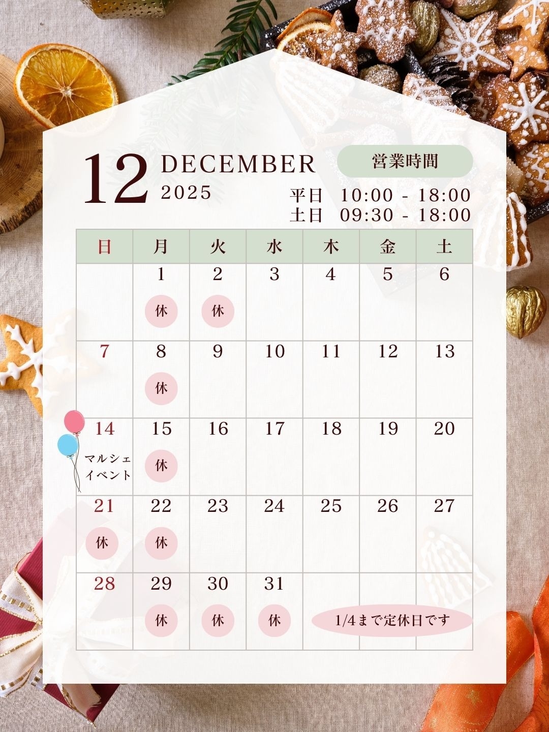 12月の定休日は毎週月曜日、第一火曜日、第三日曜日、