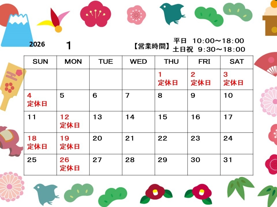 1月は第2~4月曜日と、第3日曜日を定休日とさせていただきます。