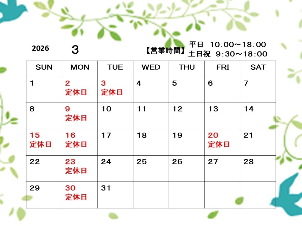 3月は毎週月曜日、第1火曜日、第3日曜日、20日(金・祝)を定休日とさせていただきます。