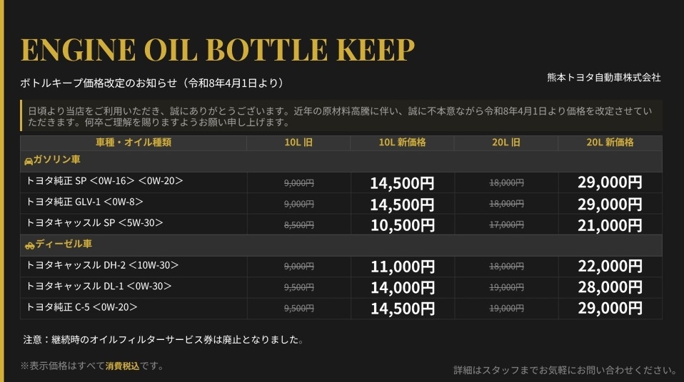 ボトルキープ価格改定のお知らせ