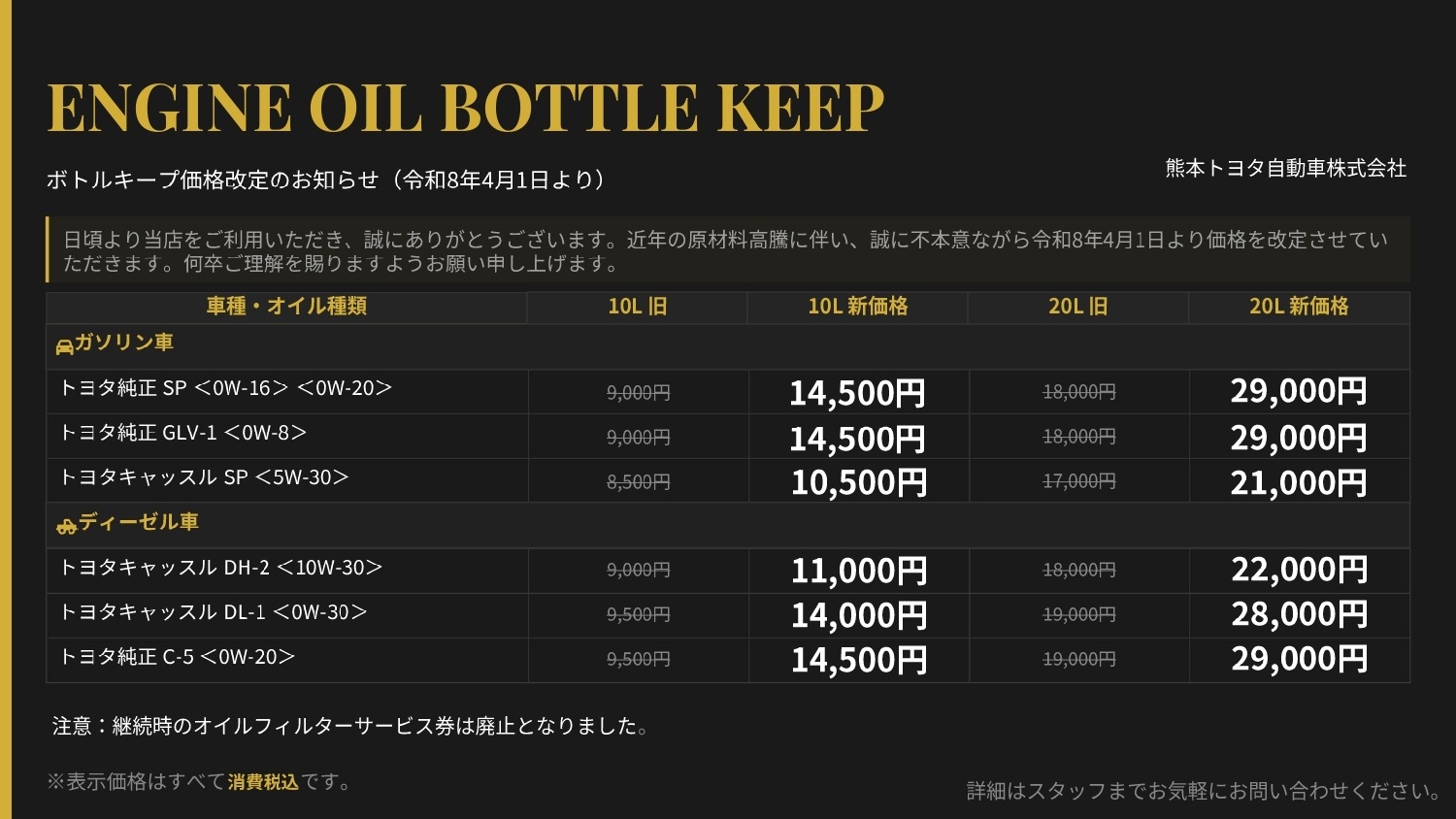 エンジンオイルボトルキープ価格改定のお知らせです。
