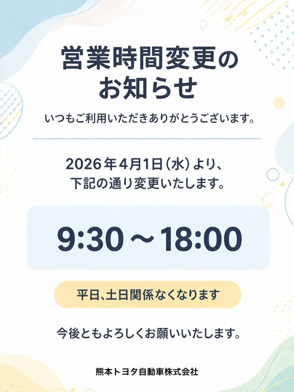 これまで平日と土日で異なっておりました営業時間を2026年4月1日より下記の通り統一いたします✨
