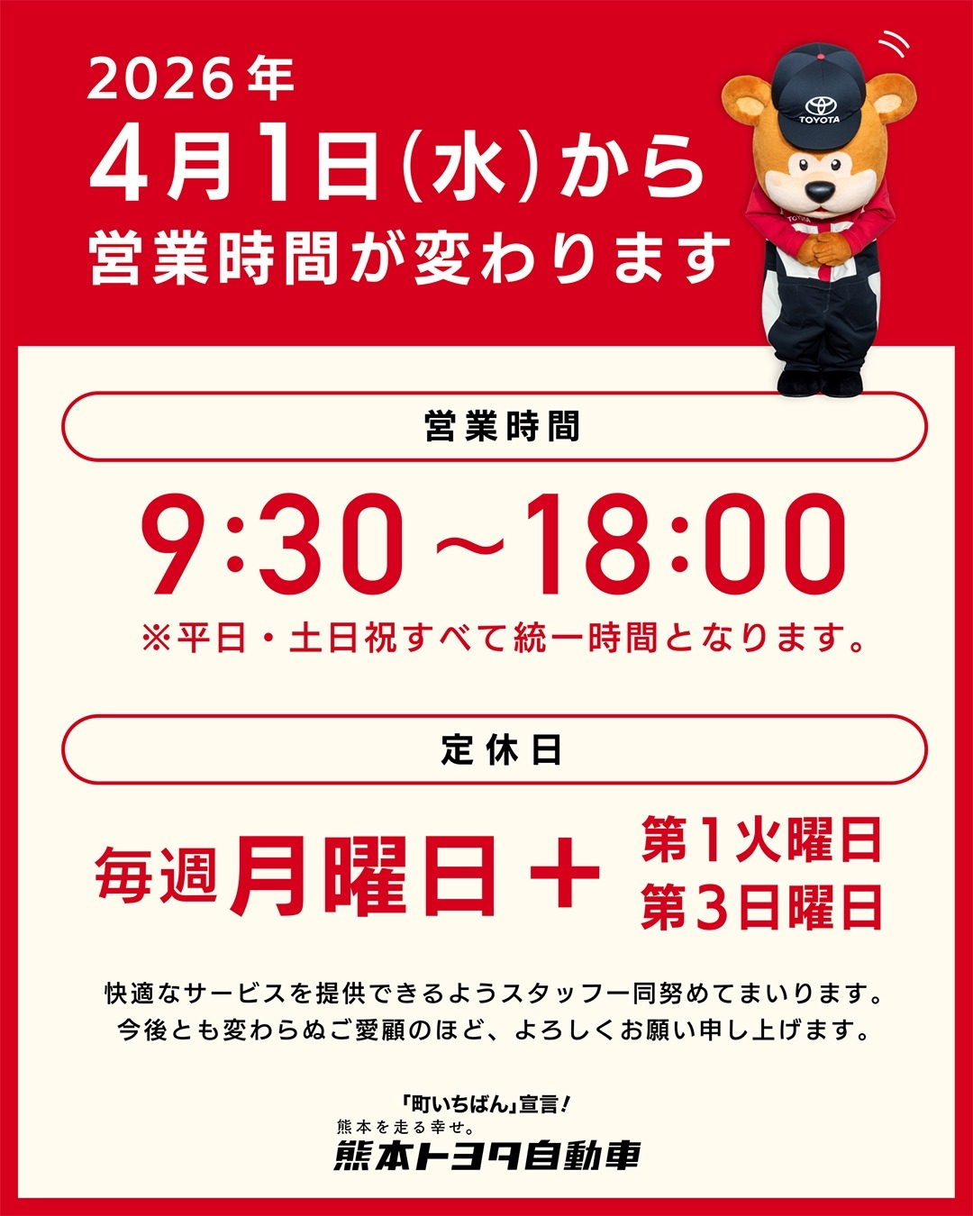 2026年4月1日(水)より、営業時間を変更させていただきます。