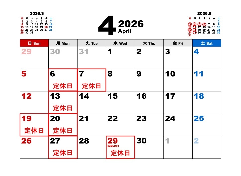4月の定休日は毎週月曜日と7日(火)19日(日)29日(水)になります。