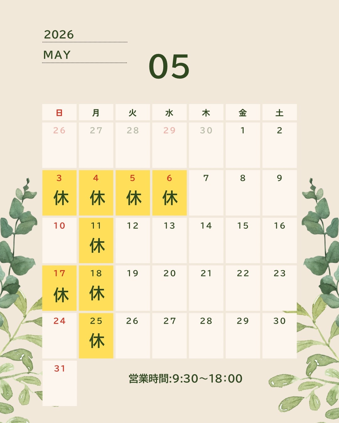 5月の定休はご覧の通りです♪